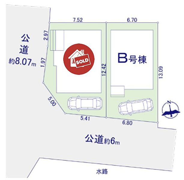 | 駐車場 | 1台 | 道路の幅員 | 道路幅:6m・8m、アスファルト舗装、南面6m公道、西面8.07m公道 |