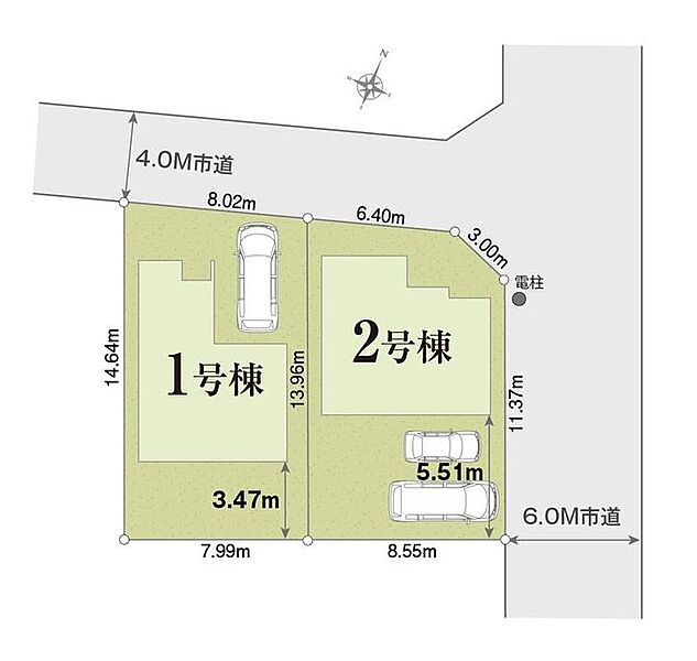 | 駐車場 | 1台 ~ 2台(1台(1号棟)・車種により2台(2号棟)) | 道路の幅員 | 道路幅:4m・6m、アスファルト舗装、北側4m市道、東側6m市道 |