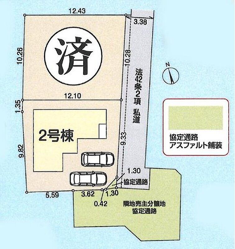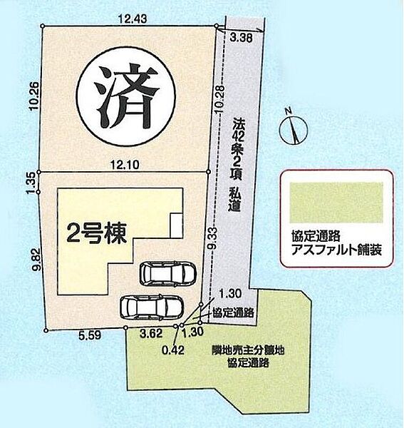 | 駐車場 | 2台 | 道路の幅員 | 道路幅:3.3m、アスファルト舗装、東側 3.38m私道 |