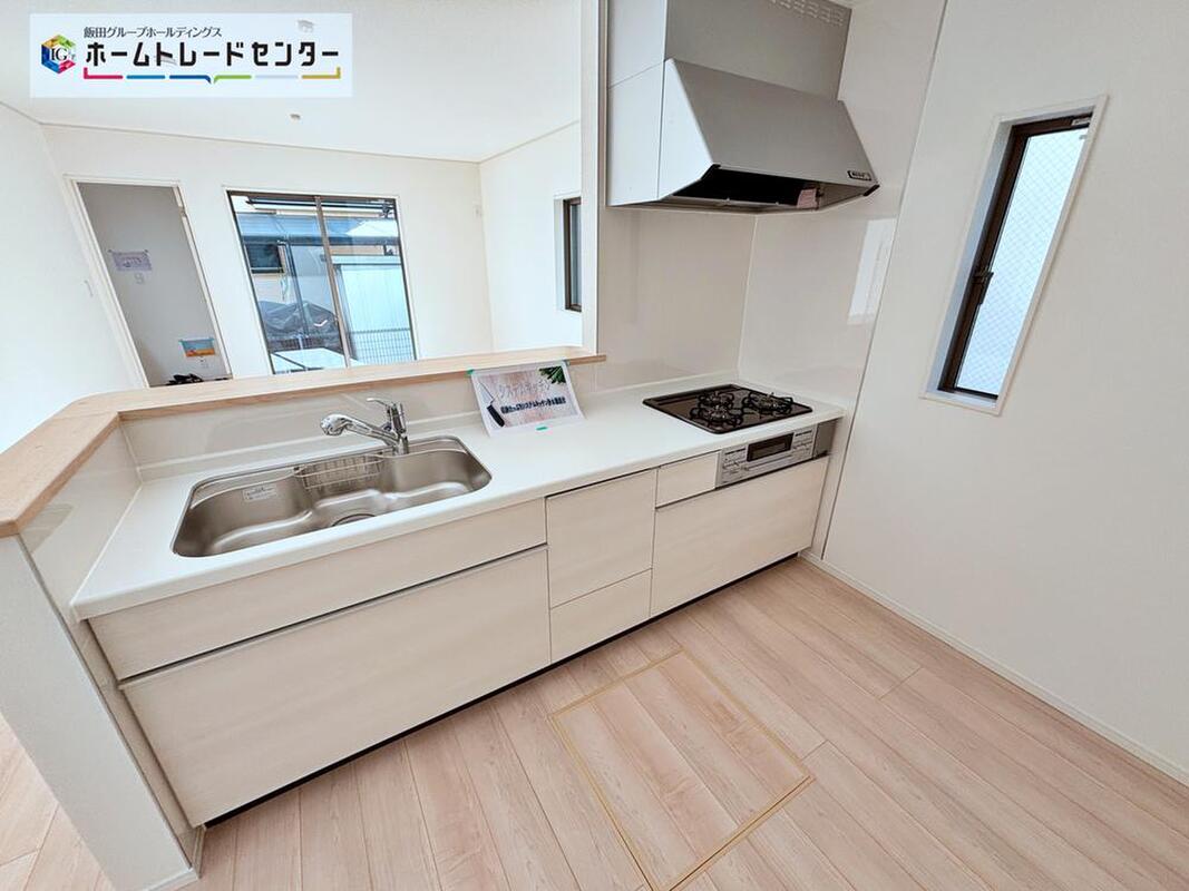 作業スペースを大きくとったキッチン。夫婦そろってキッチンに立っても調理がしやすくゆとりある広さ。食器類もすっきりと片付く収納力が期待できます。