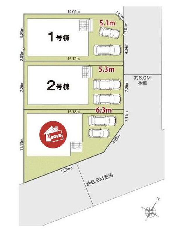 | 駐車場 | 2台(※車種による) | 道路の幅員 | 道路幅:6m・6.9m、アスファルト舗装、南側約6.9m都道、東側6.0m私道 |
