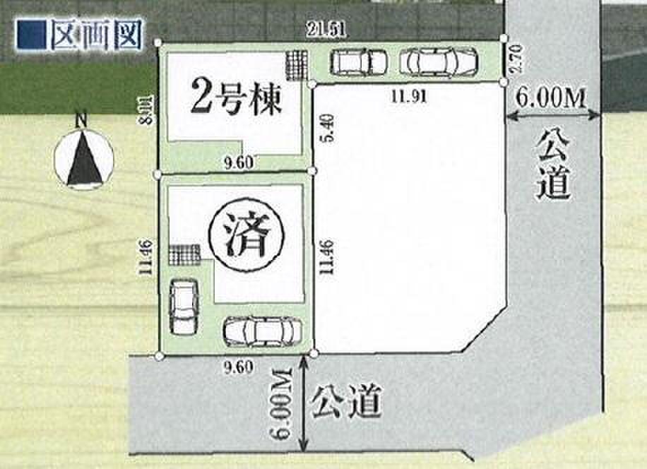 | 駐車場 | 2台(※車種による) | 道路の幅員 | 道路幅:6m、アスファルト舗装、南側6.0m公道、東側6.0m公道 |