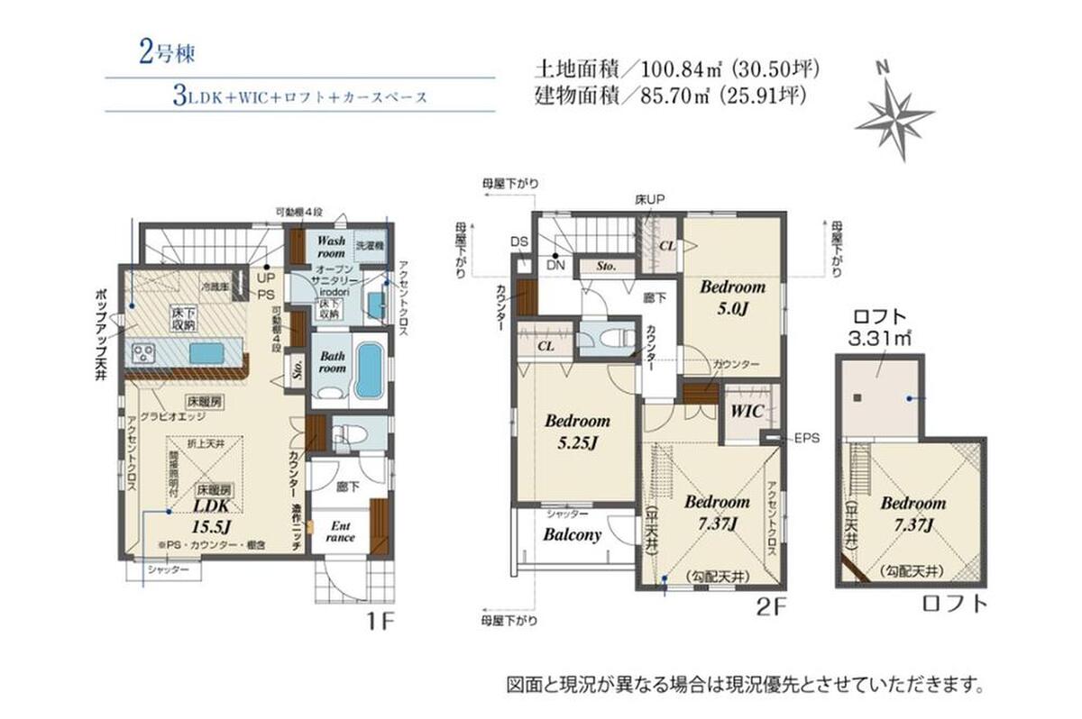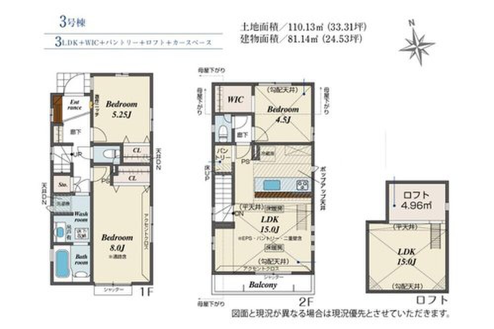 | 建物面積 | 81.14m2・85.7m2 | 土地面積 | 100.84m2・110.13m2 |