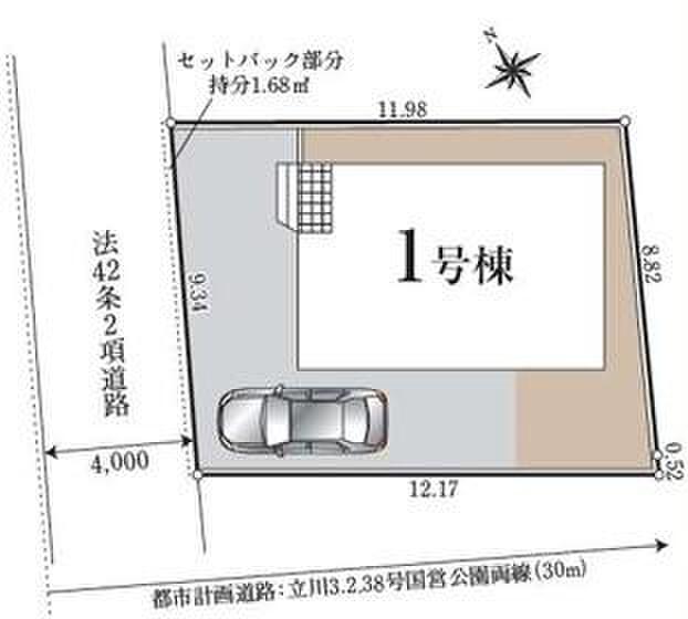 | 駐車場 | 1台 | 道路の幅員 | 道路幅:4m、アスファルト舗装、西側4m公道(法42条2項道路)セットバック済 |