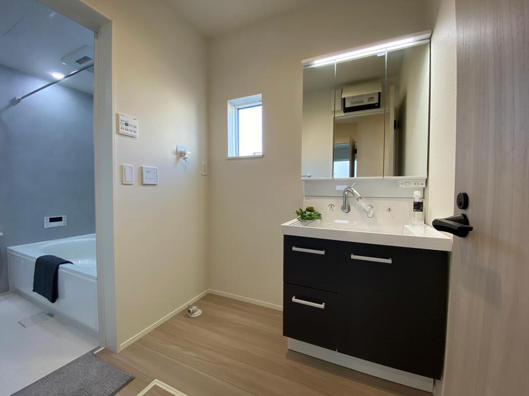 十分な大きさの洗面台は収納もさる事ながら、身だしなみチェックや歯磨きなど、朝の慌ただしい時間でも余裕とゆとりを感じて頂けます。(家具や小物はつきません)