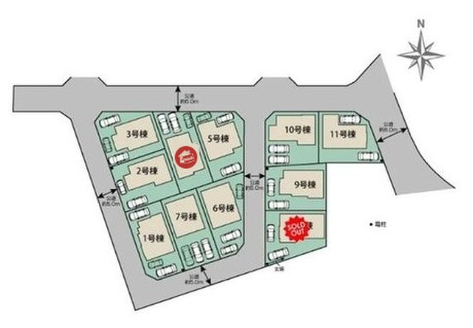 | 駐車場 | 2台 ~ 3台(2台(2号棟、9~11号棟)3台(1~7号棟)※車種による) | 道路の幅員 | 道路幅:5m~6m、アスファルト舗装、北6.0m公道、東6.0m公道、開発区域内新設道路5.0m公道 |