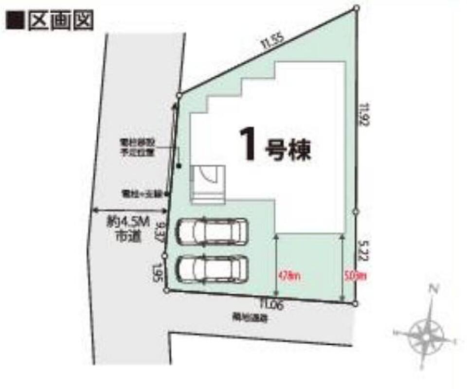 | 駐車場 | 2台 | 道路の幅員 | 道路幅:4.5m、アスファルト舗装、西:4.5m市道 |