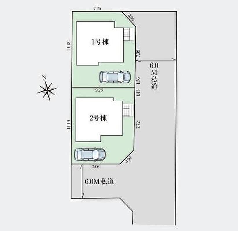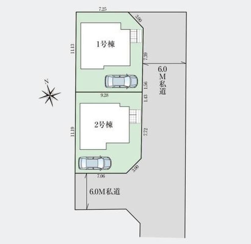 | 駐車場 | 1台 | 道路の幅員 | 道路幅:6m、アスファルト舗装、側6.0m 南側6.0m 私道 |