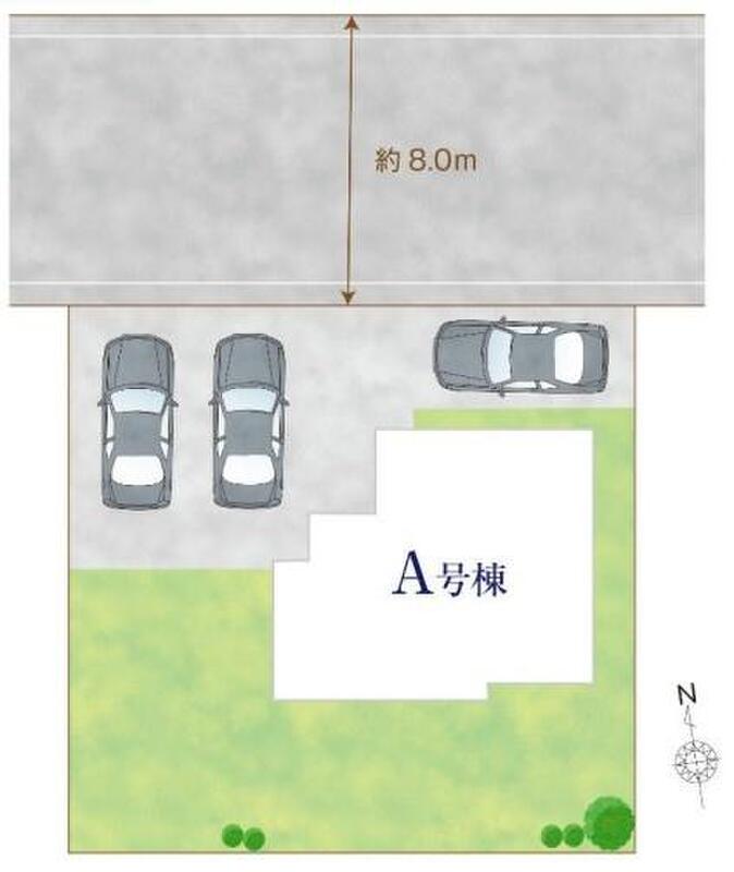 | 駐車場 | 3台 | 道路の幅員 | 道路幅:8m、アスファルト舗装、北側約8m公道 |
