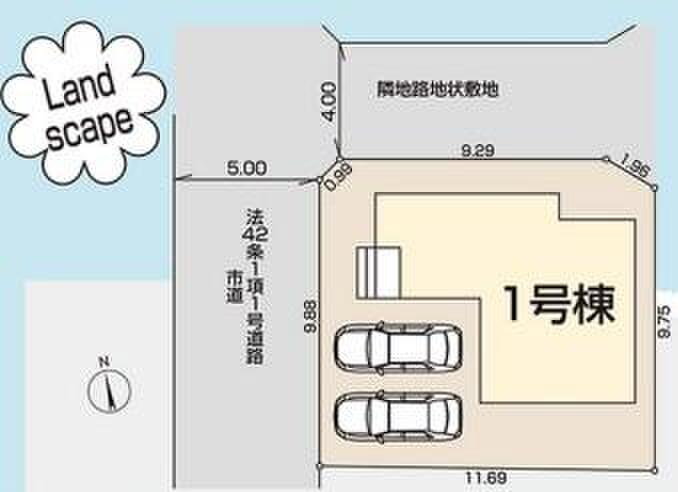 | 駐車場 | 2台 | 道路の幅員 | 道路幅:4m・5m、アスファルト舗装、西側5m公道・北側4m私道 |