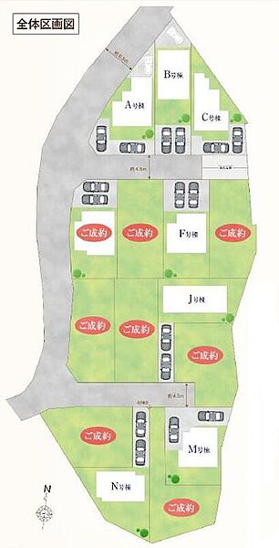 | 駐車場 | 2台 ~ 3台(A・B号棟(3台)、C・F・J・N・M号棟(2台)) | 道路の幅員 | 道路幅:4.5m・6.3m、アスファルト舗装、西側約6.3m公道、分譲地内4.5m私道 |