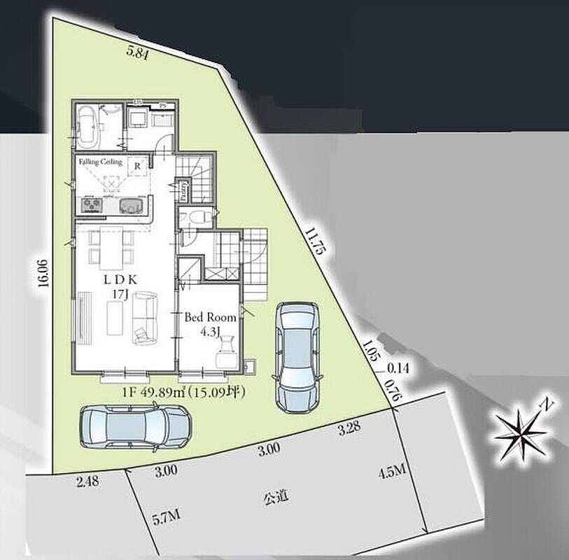 | 駐車場 | 2台 | 道路の幅員 | 道路幅:4.5m~5.7m、アスファルト舗装、南東側4.5~5.7m公道 |