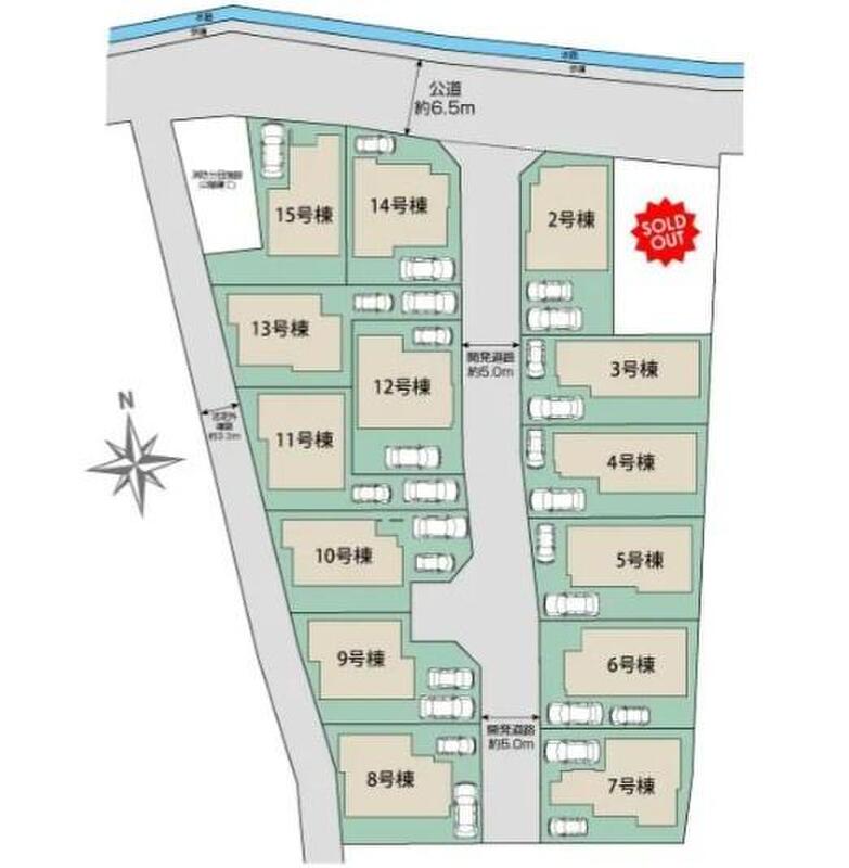 | 駐車場 | 1台 ~ 2台(15号棟(1台)・2~14号棟(2台)) | 道路の幅員 | 道路幅:5m・6.5m、アスファルト舗装、他備考欄参照 |