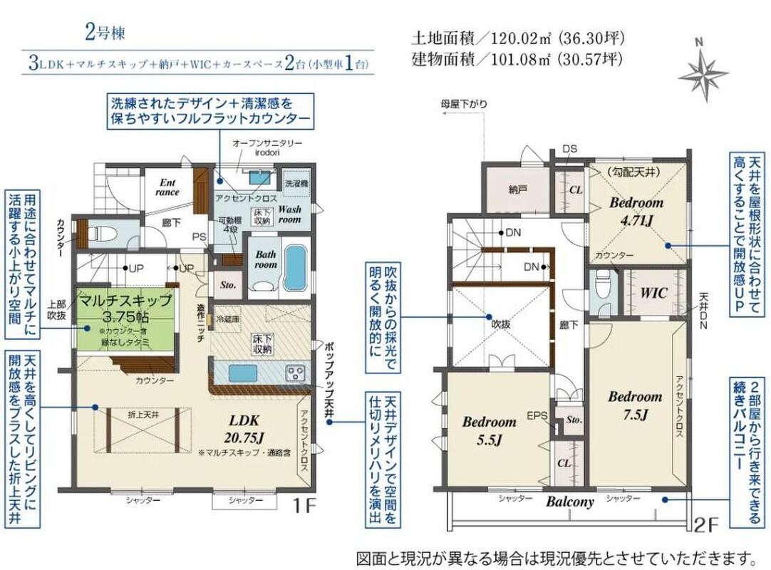 2号棟 間取り 3LDK+S 価格 5580万円 建物面積 101.08m2 土地面積 120.02m2 -