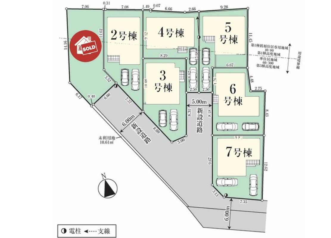 | 駐車場 | 2台(※車種による) | 道路の幅員 | 道路幅:5m・6m、アスファルト舗装、南側6m公道私道 、新設道路6m私道、新設道路5m私道 |