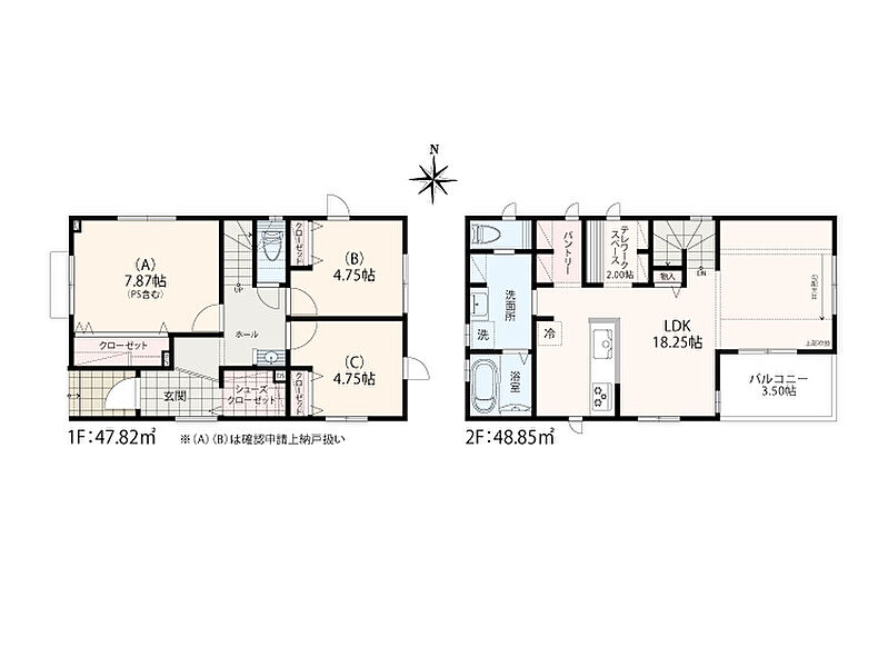 | 建物面積 | 2号棟:96.67m2(29.24坪) | 土地面積 | 2号棟:140.75m2(42.57坪) |