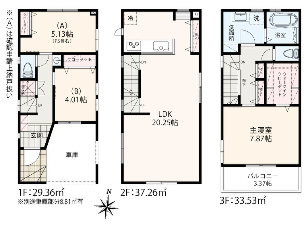 | 間取り | 2LDK+S+WIC | 建物構造 | 木造3階建 |