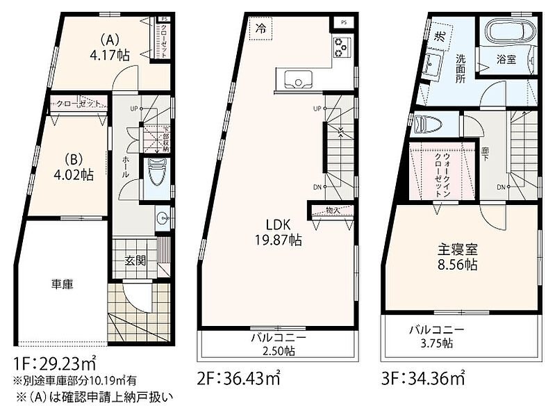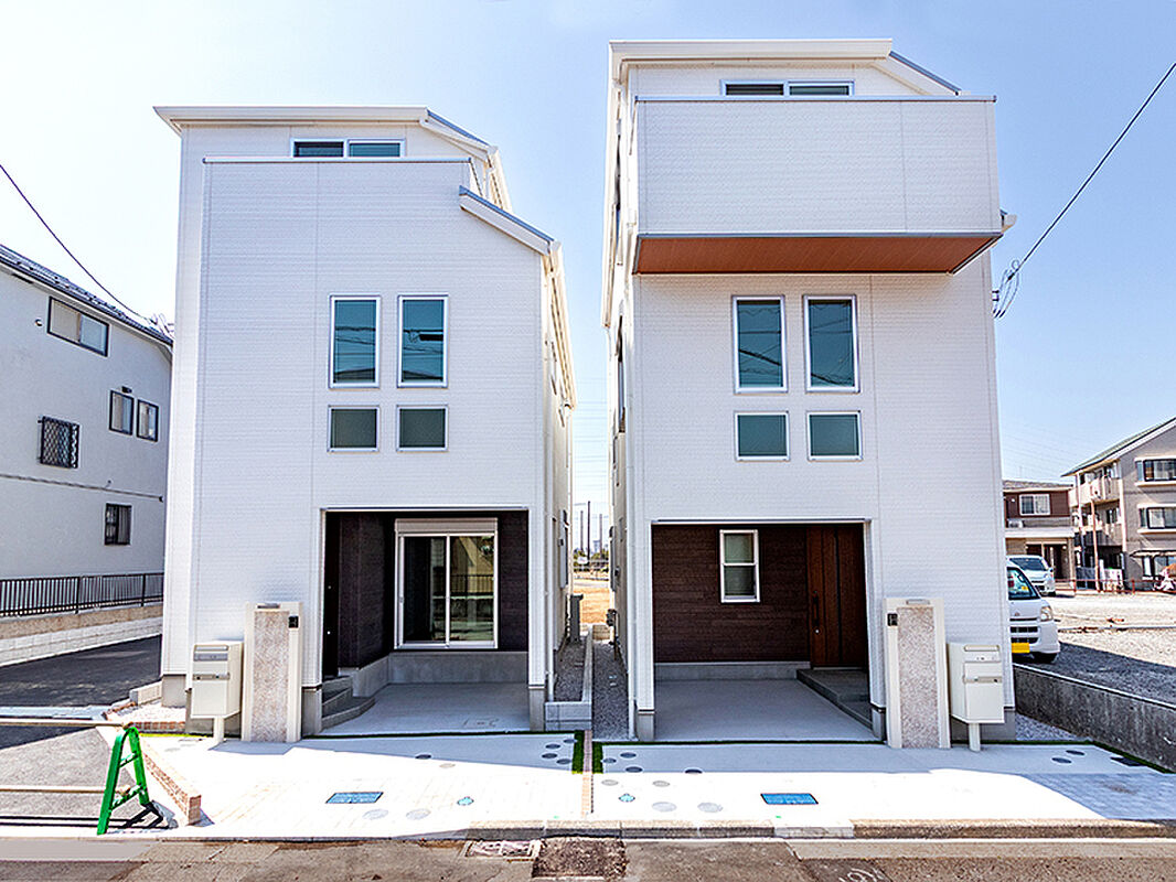 | 建物面積 | 1号棟:100.02m2(30.25坪)別途車庫部分10.19m2有 2号棟:100.15m2(30.29坪)別途車庫部分8.81m2有 | 土地面積 | 1号棟:65.62m2(19.85坪)2号棟:64.45m2(19.49坪) |