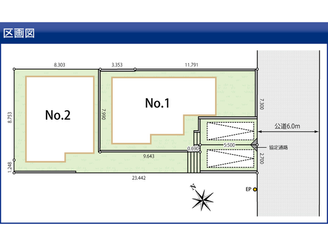 | 駐車場 | 1台 | 道路の幅員 | 南東側6.0m公道 ※車庫部分に協定通路有 |