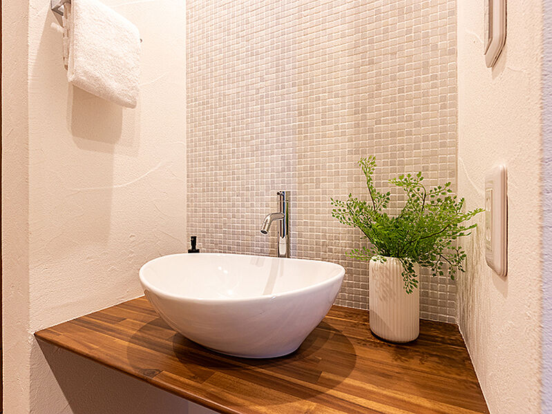 ◆1階玄関には、帰宅してすぐにうがい&手洗いのできる手洗い洗面台を設置。