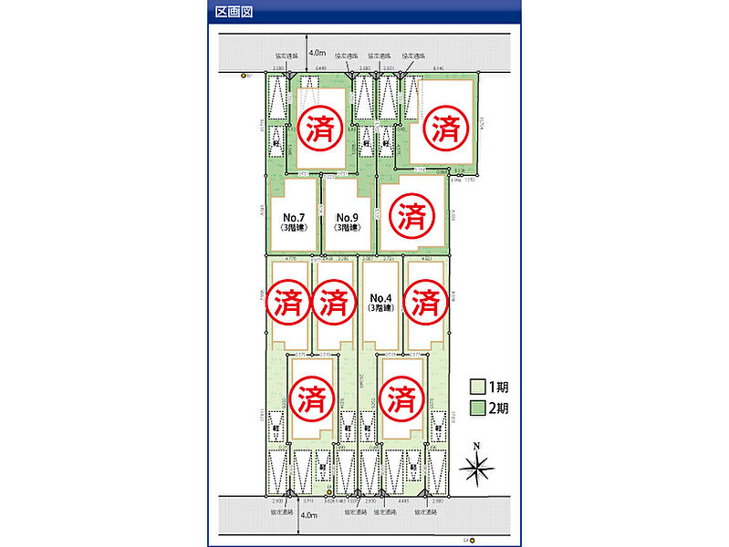 | 駐車場 | 2台(縦列2台:4・7・9号棟 ※2台目は軽自動車) | 道路の幅員 | 1期:南側約4m公道 2期:北側約4m公道 |