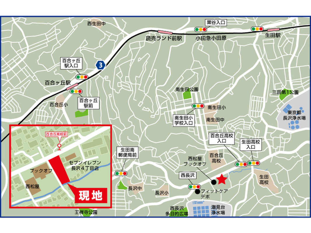 小田急小田原線「生田」駅 川崎市営バス7分 「西長沢」バス停 徒歩4分 小田急小田原線「百合ヶ丘」駅 小田急バス9分 「西長沢」駅バス停 徒歩3分 小田急小田原線「新百合ヶ丘」駅 小田急バス14分 「西長沢」駅バス停 徒歩1分 |