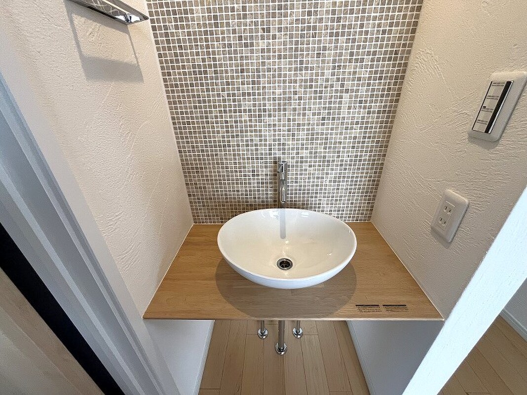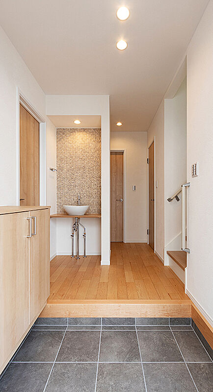 ◆1階玄関には、帰宅してすぐにうがい&手洗いのできる手洗い洗面台を設置。