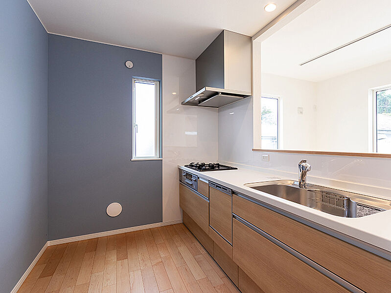 ◆室内の壁は調湿や消臭効果のある自然素材のしっくい、床材は天然木複合フローリングを採用。