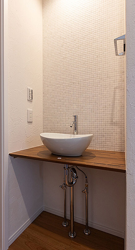 洗面室には物の大きさに合わせて高さが調節できる可動棚を設置。タ...