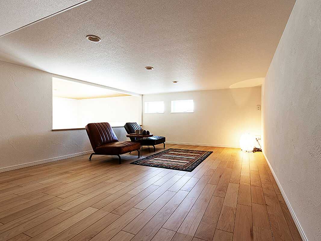 天井高の大空間リビングは、フロア全てを使いさらに広さを演出しています。収納の少ない部屋をいくつも設けるより大きな収納や家事動線を確保した、こだわりの間取が魅力です。