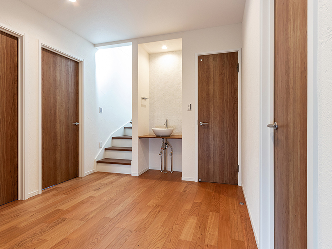 ◆1階玄関には、帰宅してすぐにうがい&手洗いのできる手洗い洗面台を設置。