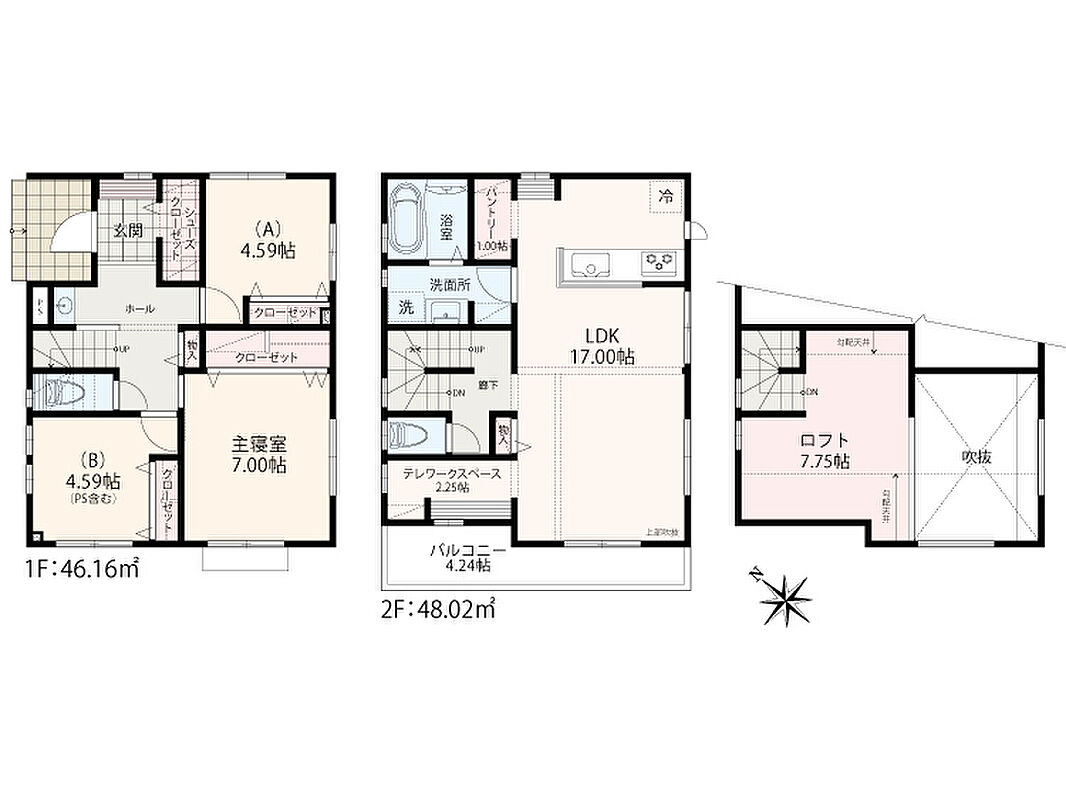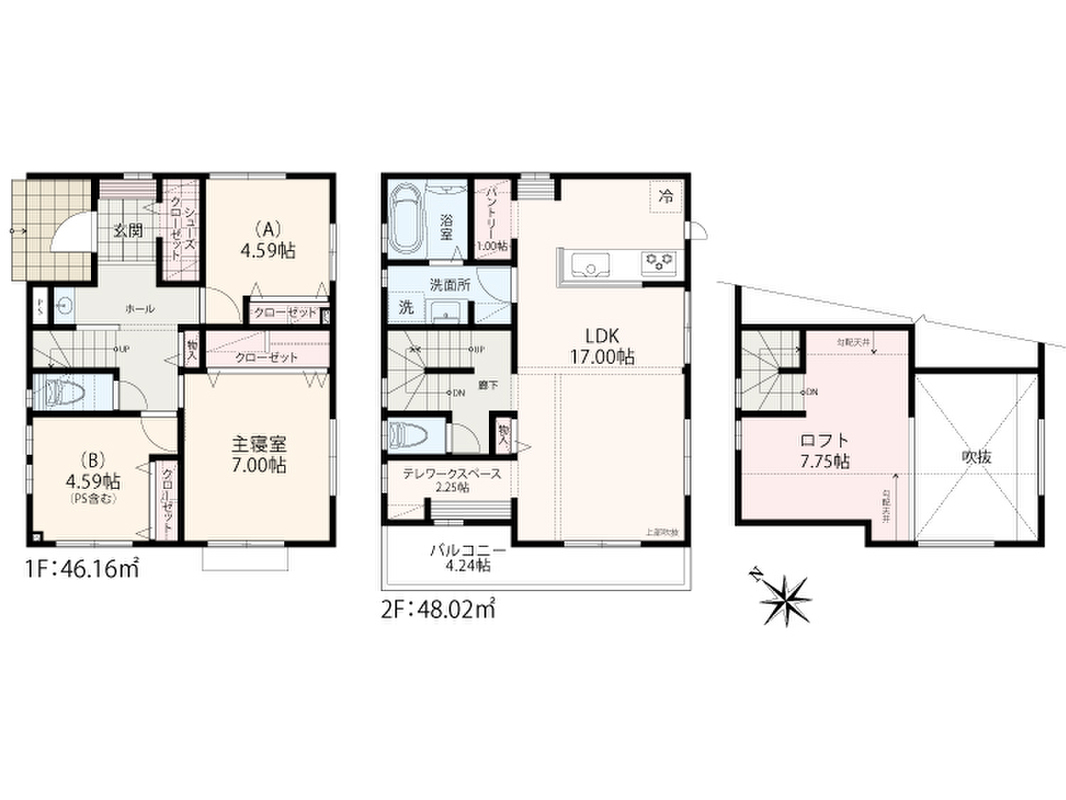 | 建物面積 | 5号棟:93.56m2(28.30坪) 6号棟:94.18m2(28.48坪) | 土地面積 | 5号棟:157.56m2(47.66坪) 6号棟:157.55m2(47.65坪) |