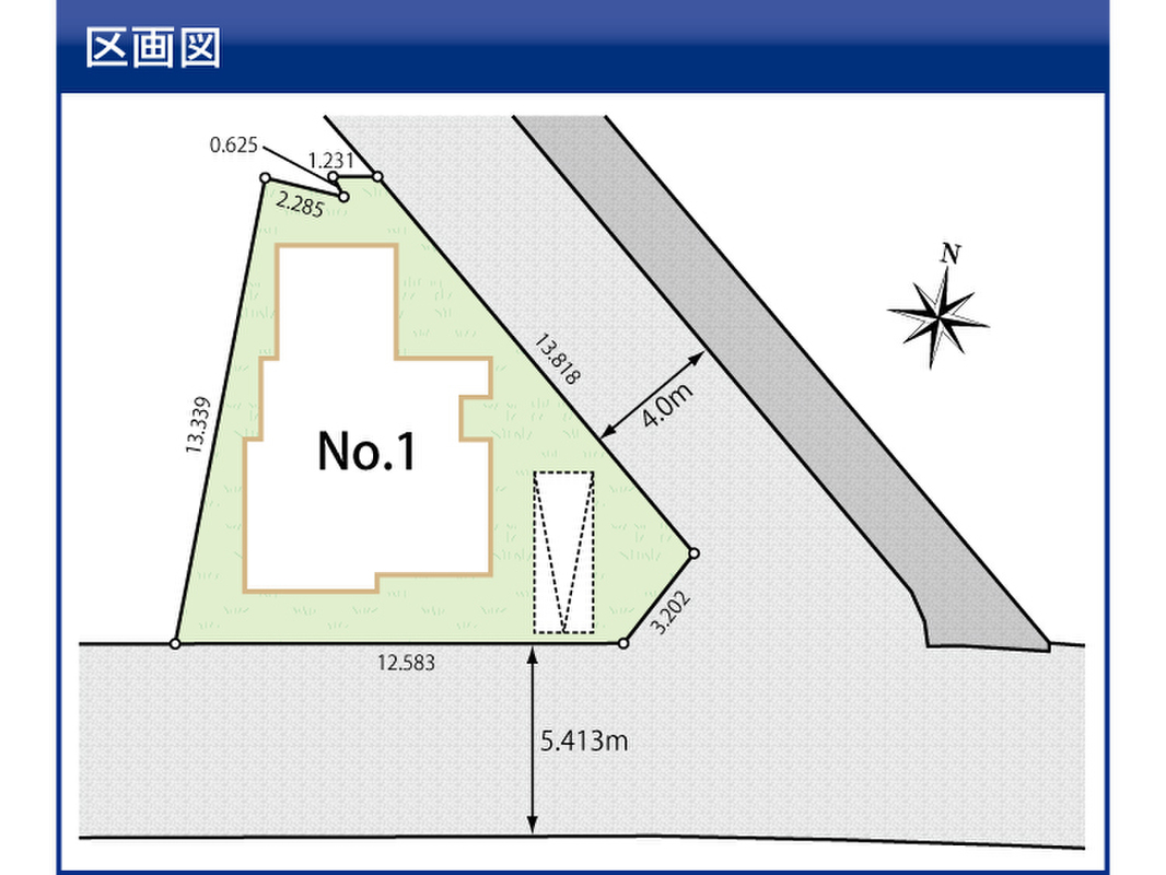 | 駐車場 | 1台 | 道路の幅員 | 南側5.413m公道・北東側4.0m私道 |