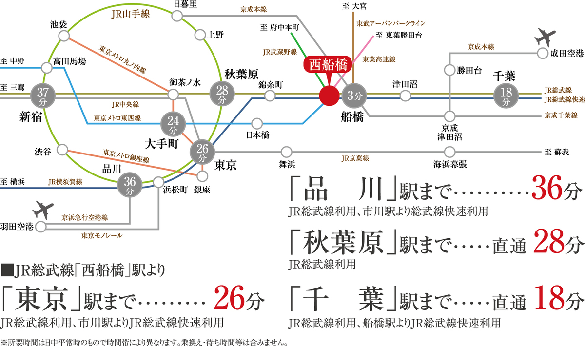 JR総武線「西船橋」駅 徒歩11分 東京メトロ東西線「西船橋」駅 徒歩11分 JR武蔵野線「西船橋」駅 徒歩11分 |