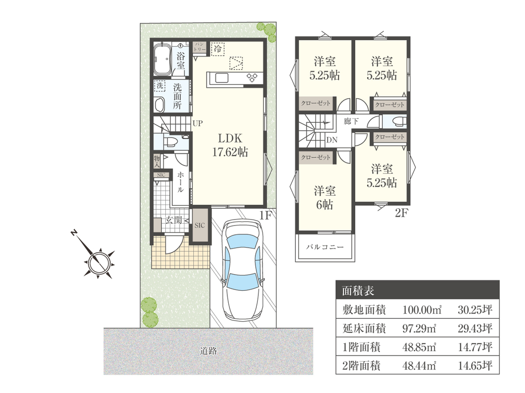 | 建物面積 | 97.29m2 | 土地面積 | 100.00m2(1区画) |
