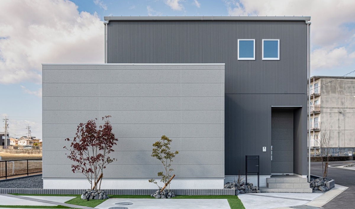 50年先を考え、家族構成が変化しても住まいを「やり直す(redo)」必要がない「リドレス(redo-less)」スマートでモダンな印象のグレーの外観は、1階に外からの目線が気にならない壁を設けています