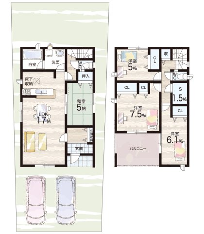 - ※完成予想図やCG合成画像は、門塀・植栽・庭・外観等、実際とは多少異なる場合があります。