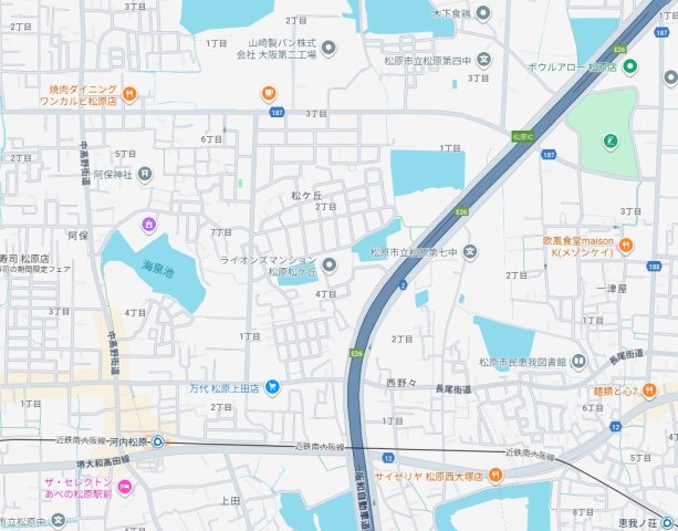 近鉄南大阪線「河内松原」駅 徒歩10分 近鉄南大阪線「恵我ノ荘」駅 徒歩21分 近鉄南大阪線「高見ノ里」駅 徒歩23分 |