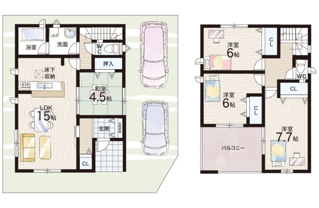 - ※完成予想図やCG合成画像は、門塀・植栽・庭・外観等、実際とは多少異なる場合があります。