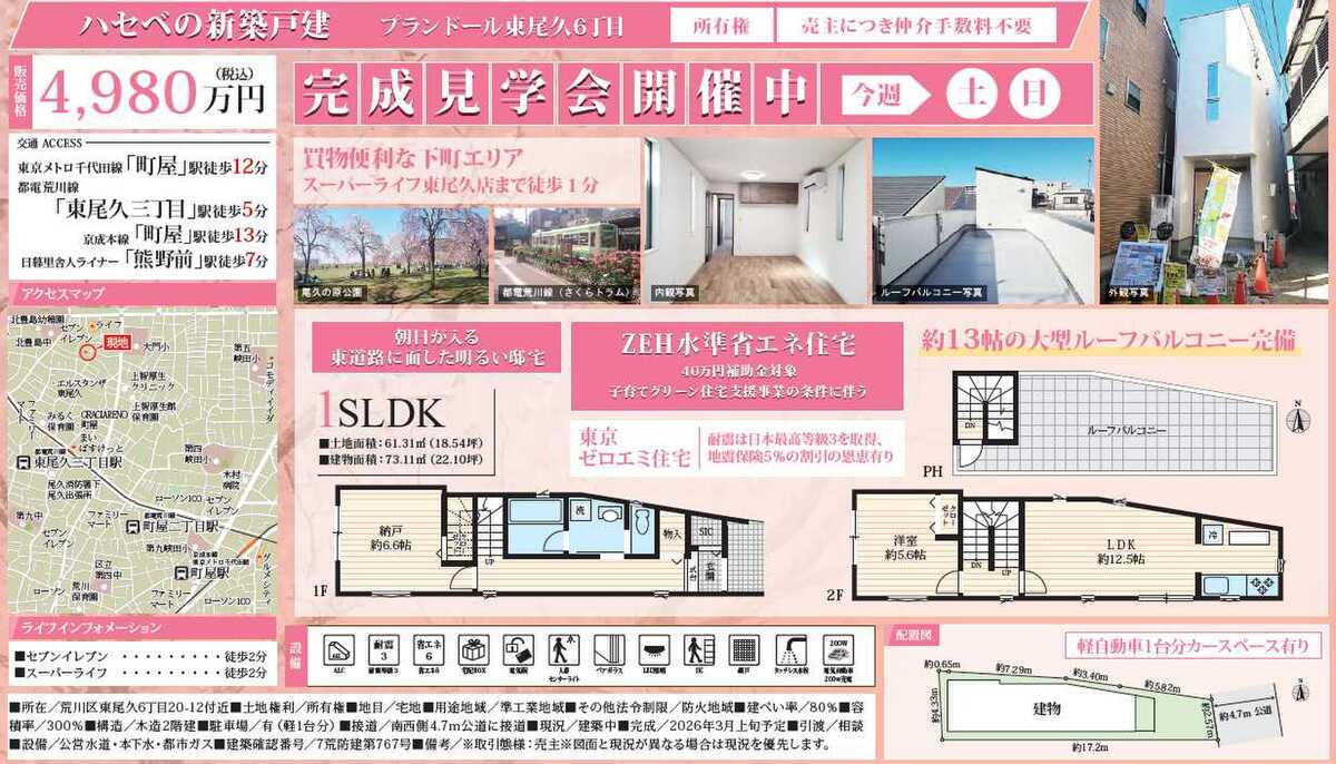 新築一戸建て プランドール東尾久6 所有権 約13帖大型ルーフバルコニー 町屋駅12分 ZEH水準住宅 耐震3