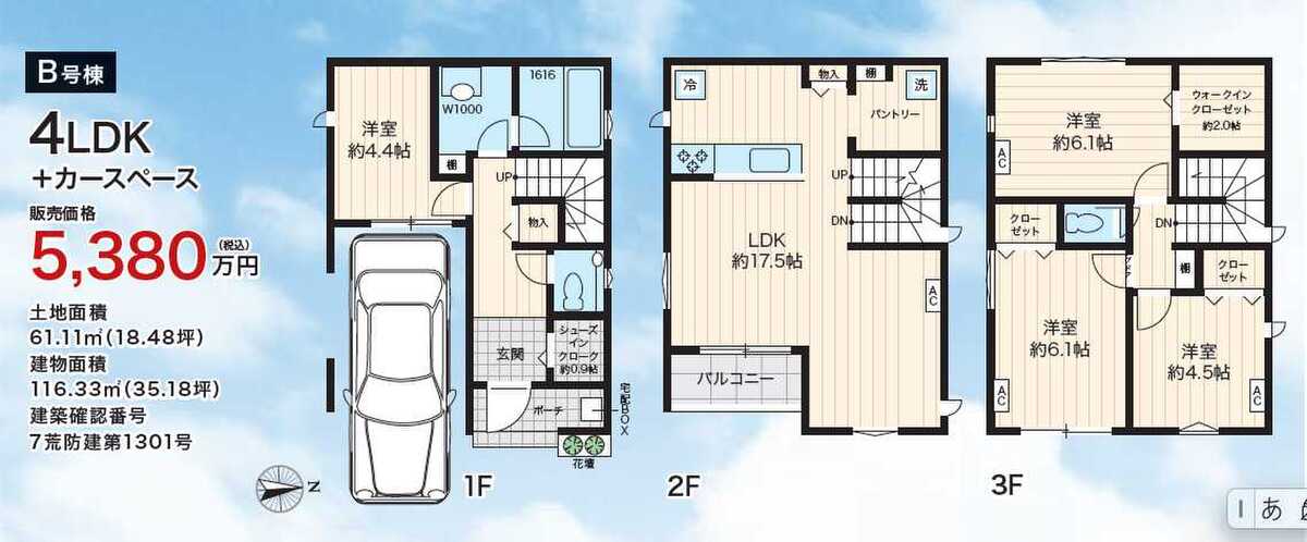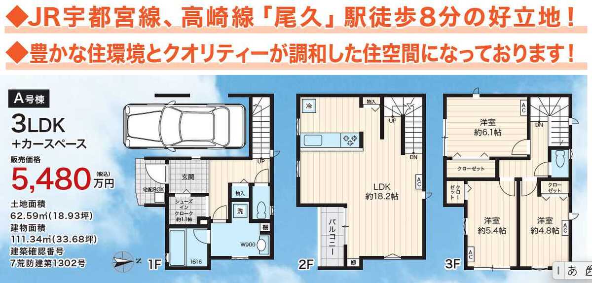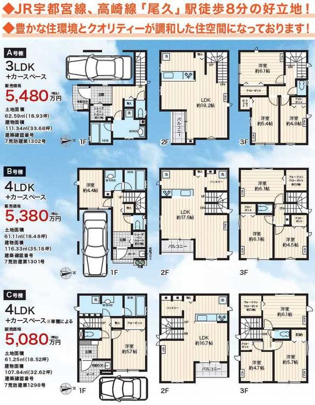 | 建物面積 | 107.84m2~116.33m2 | 土地面積 | 61.11m2(3区画)~62.59m2 |