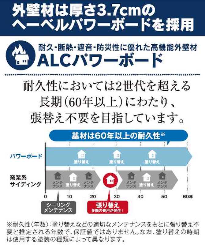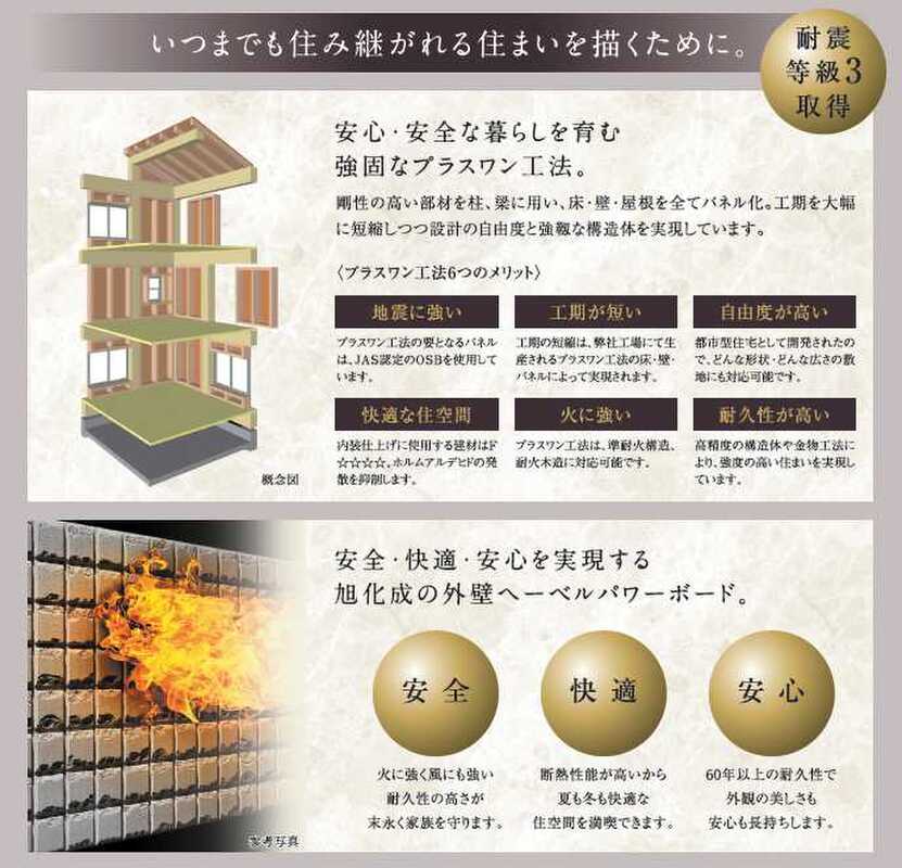 ■耐震最高等級取得(耐震等級3) 建築基準法に定められている耐震基準の1.5倍の耐震強度!■耐火性・耐久性に優れた厚み37ミリ次世代高機能外壁材「ヘーベルパワーボード」を採用しております。