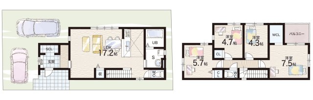 - ※完成予想図やCG合成画像は、門塀・植栽・庭・外観等、実際とは多少異なる場合があります。