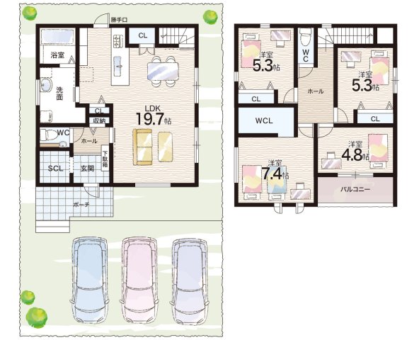- ※完成予想図やCG合成画像は、門塀・植栽・庭・外観等、実際とは多少異なる場合があります。