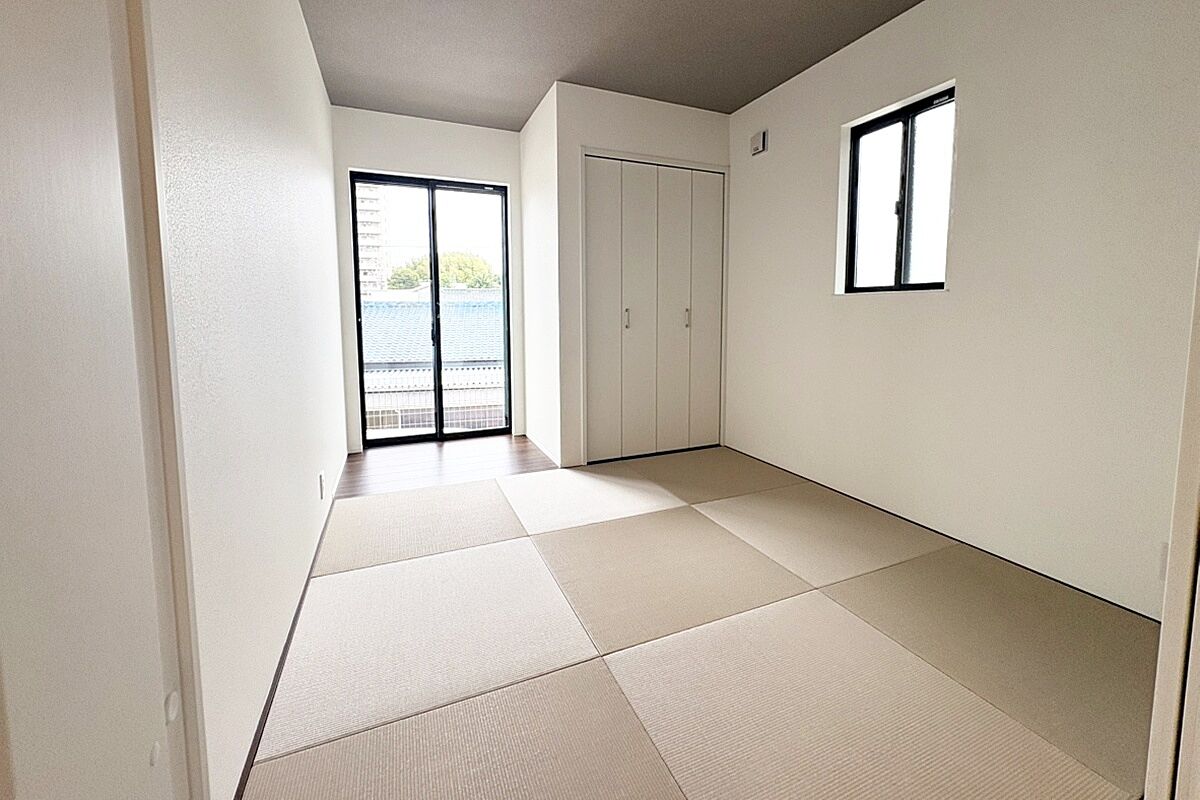 灰桜色の畳を使用した5.2帖の和室。収納スペースもあり、来客用...