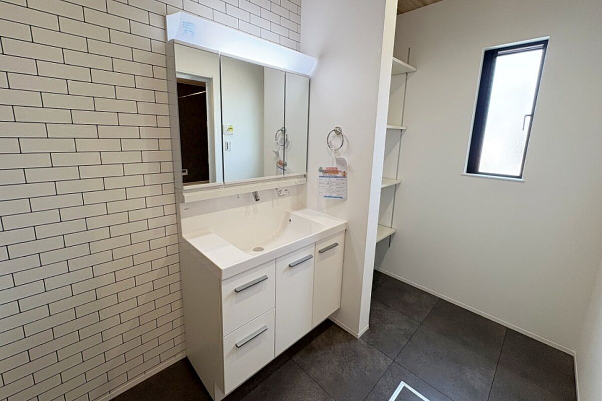 レンガ調のクロスがクラシカルな洗面所。可動棚収納スペースもあり...