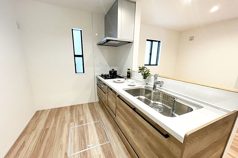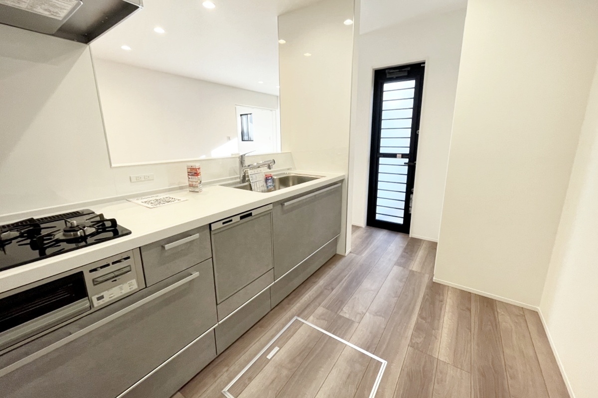 横幅2,550ミリのワイドタイプのシステムキッチン。食器洗い乾燥機付きです。構造体が「ステンレス」で設計されている為、経年劣化による腐敗やにおいを気にする必要のない、ランニングコストにも優れたキッチンとなっています。