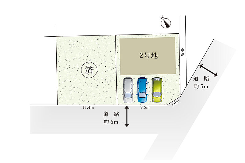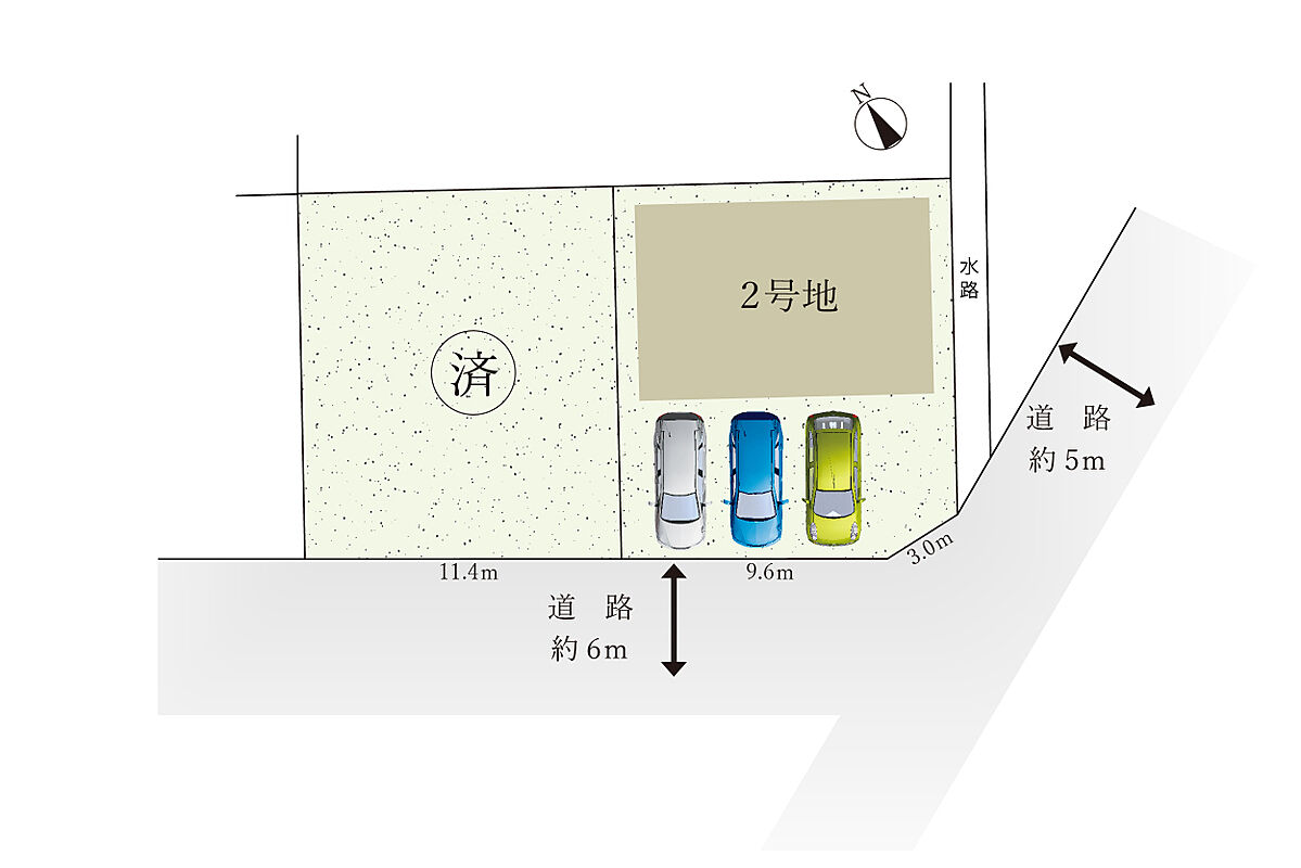 | 駐車場 | - | 道路の幅員 | 道路幅:5m・6m、アスファルト舗装、南東側 幅員 約5m、南西側 幅員 約6m の公道に接する |