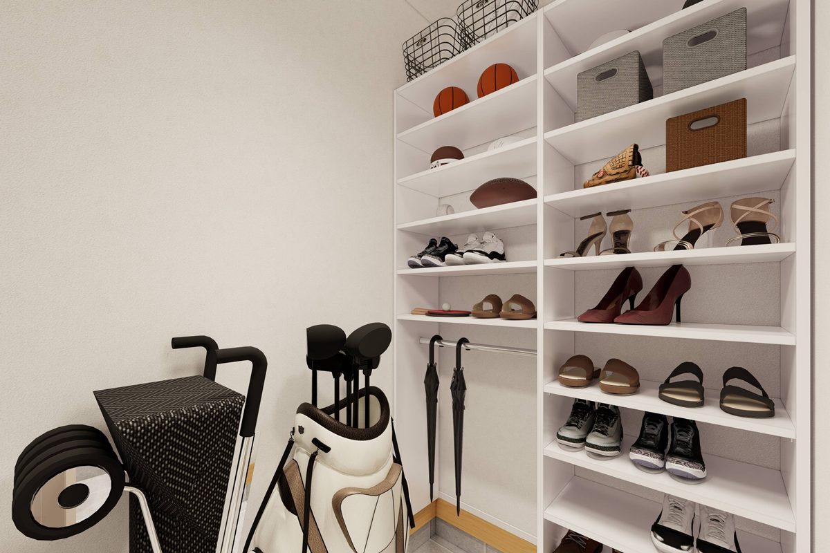 ・アウトドアグッズ等もまとめて収納できるシューズクローク