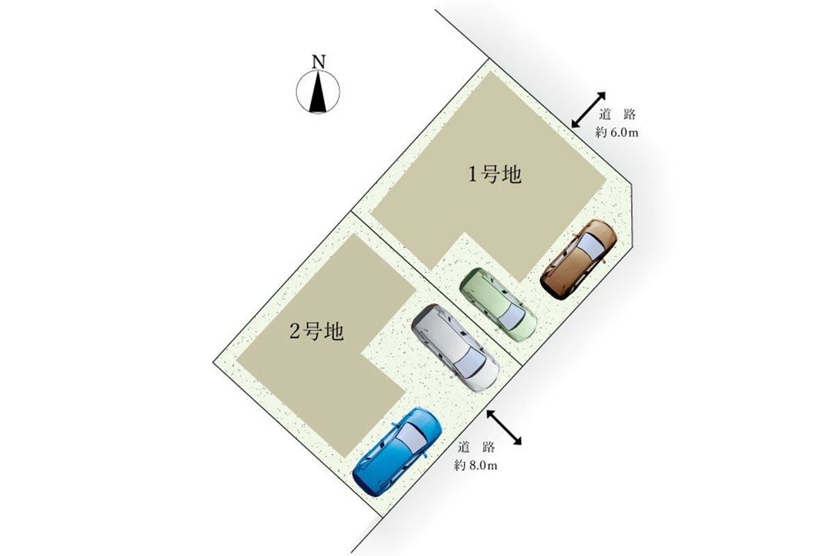 | 駐車場 | 2台 | 道路の幅員 | 北東側幅員約6.0m、南東側幅員約8.0mの公道に接する |